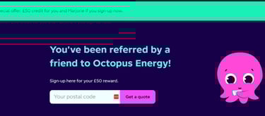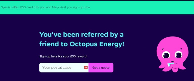 If you recently signed up to Octopus Energy and didn't go through a Friends Link? You still might have time to get this bonus! Check your online account for a "Forgot Your Referral?" box on the Homepage, and enter lucky-ibis-477👍